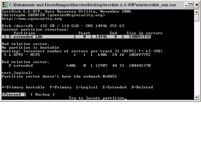 Wenn deine Partition gefunden werden sollte, markiere die mal und drücke p ob deine Daten oder eine Fehlermeldung angezeigt werden.