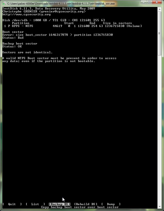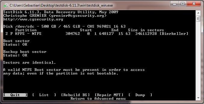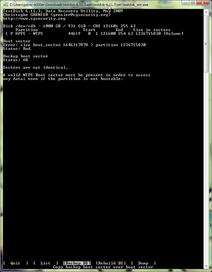 Halb so wild - das bedeutet nur, dass der Backup-Bootsektor am Ende der Partition (der Bootsektor am Anfang der Partition ist nicht mehr zu finden) doch noch richtig auf die für den Zugriff aus das Filesystem relevante MFT zeigt, und anhand dessen Inhalt eben der Zugriff möglich wurde.Der letzte Satz im 5. Bild macht mich schon wieder ganz kribbelig - was bedeutet Dieser ??