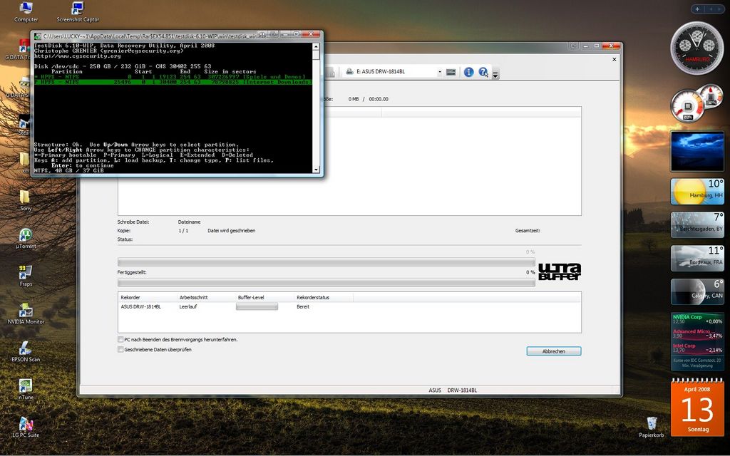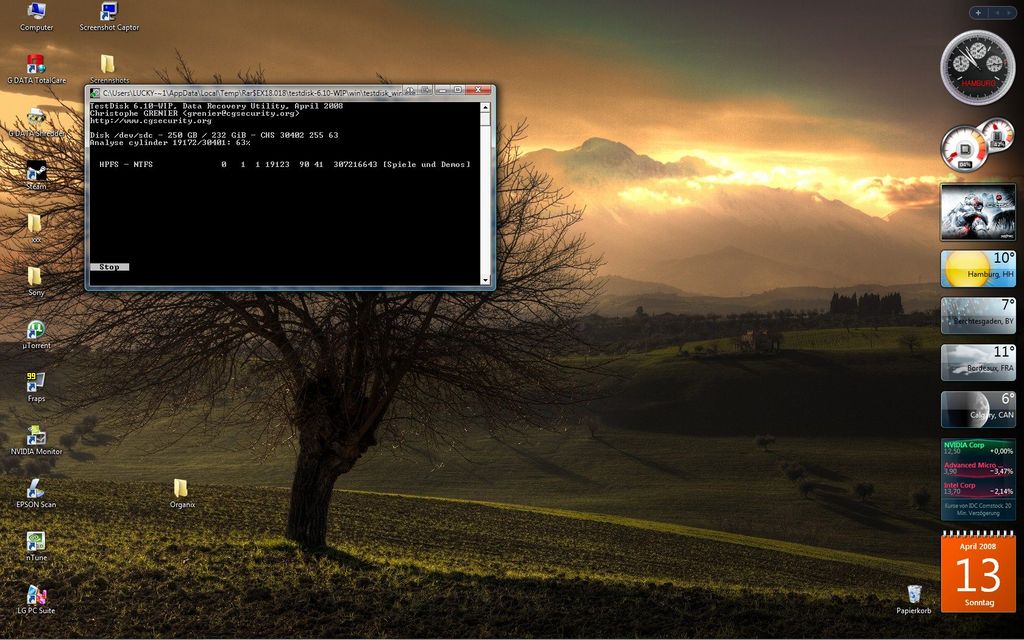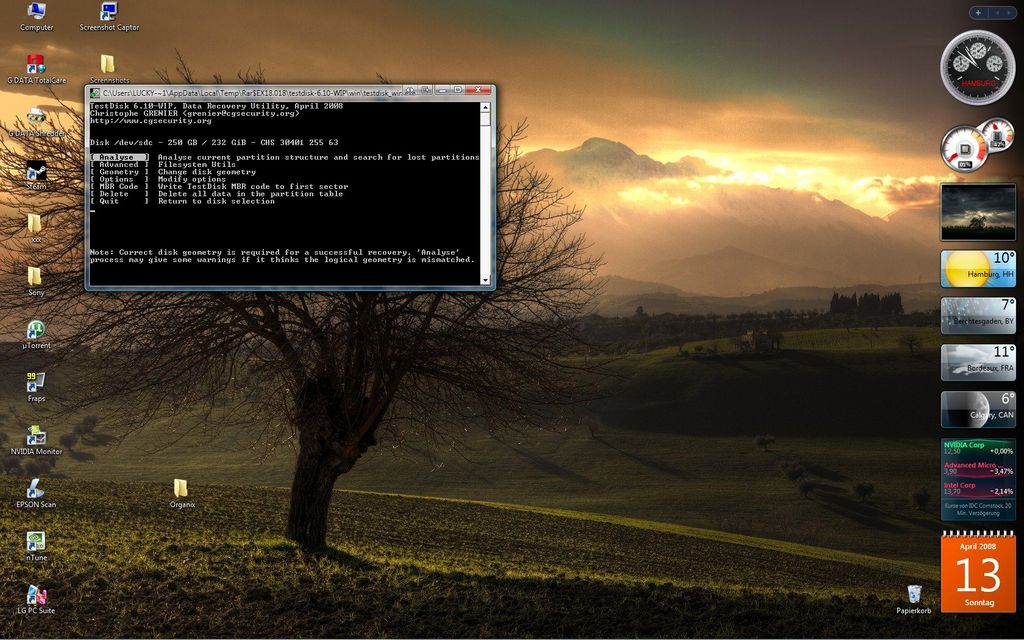 Nach dem Start von Testdisk beantwortest Du die Frage nach einer Logdatei mit Y. Den Partitionstyp solltest Du mit Intel beantworten. Dann wird Analyse aus dem dann erscheinenden Menü gewählt. Mit Quick Search wird dann der Vorgang fortgeführt (bei Vista mit Y antworten, wenn die Partitionierung unter diesem OS gemacht wurde). Wenn jetzt Partitionen gefunden wurden, kannst Du sie mit den Pfeiltasten anwählen und mit P deren Inhalt sichtbar machen. Mit Q geht es zurück ins Menü. Sollten keine Partitionen in der ersten Suche gefunden worden sein, wird mit Enter weiter gemacht, hier ist dann im Menü [ Quit ] [ Deeper Search ] [ Write ], die tiefere Suche mit Deeper SEARCH auszuwählen (dieser Vorgang kann dann schon eine Weile dauern).