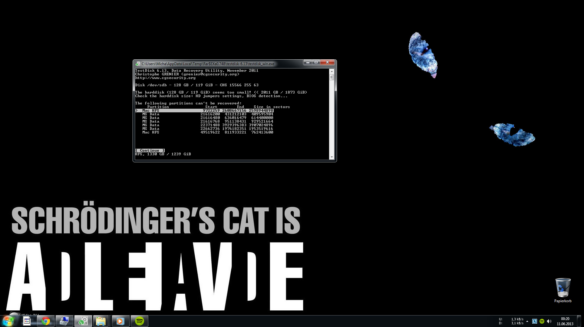 Testdisk Quickscan in Standardeinstellungen zeigte mir die genutzten 100MB von Windows/MBR (ihr wisst sicher, was ich meine) an, ferner meine C: mit 78GB, die restlichen 40, die ich für Spiele, die von einer SSD ordentlich profitieren, wurden in der Liste allerdings nicht angezeigt.
