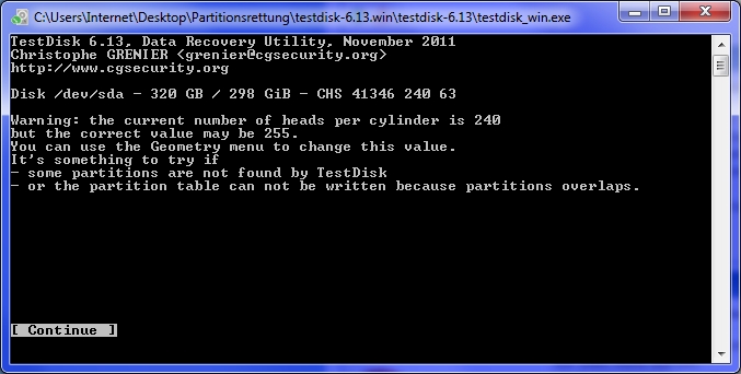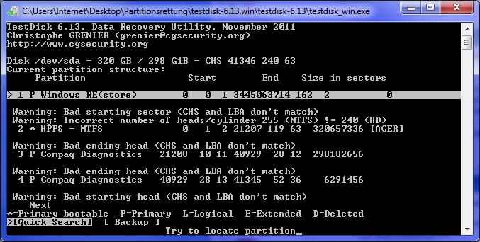 Ich habe dann im Internet nach einer Lösung gesucht und bin auf Testdisk gestoßen. Testdisk fand sogar 5 Partitionen (Ich weiß nur von 2). Dort habe ich eine Fehlermeldung erhalten. Warning: Bad Starting Sector.