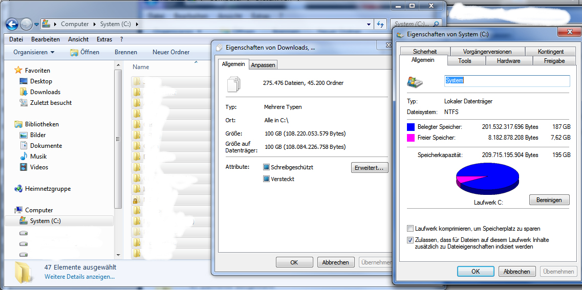 ich hab ein Problem mit meiner Systempartition. Und zwar hat diese 195GB Volumen. Mir wird jetzt angezeigt, dass knapp 8GB frei sind. Wenn ich aber auf die Partition gehe, alle Ordner + Dateien die sich darin befinden markiere und auf Eigenschaften klicke, zeigt er mir lediglich 100GB an. Wo sind denn nun die restlichen ca 85GB? Sind die Systemreserviert oder was ist damit?