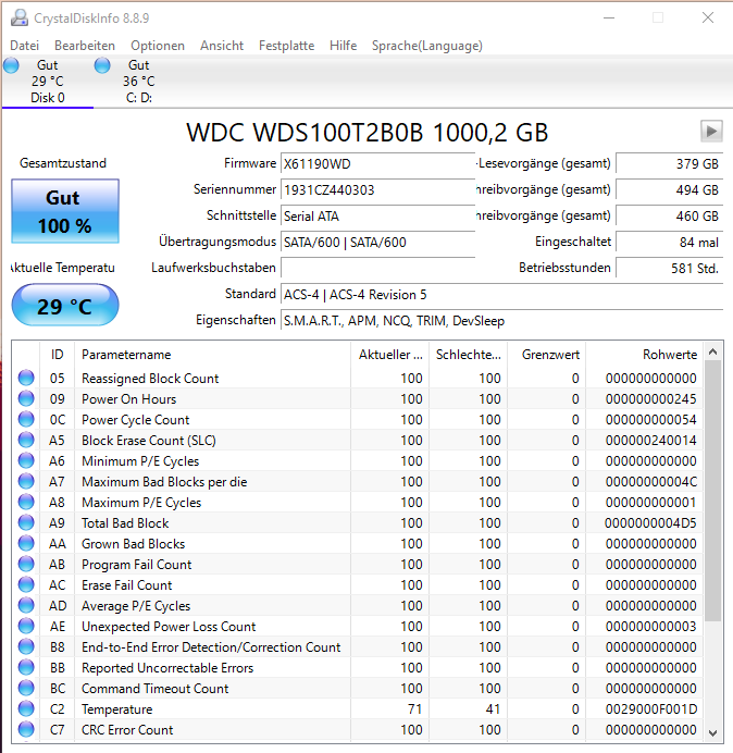 Im Anhang ist die Überprüfung beider SSDs mit DrystalDiskInfo 8.8.9.