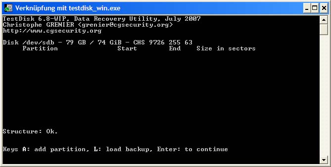 Testdisk hatte nämlich ursprünglich angezeigt: CHS 10333 240 63, jedoch mit korrekten 79 GB.