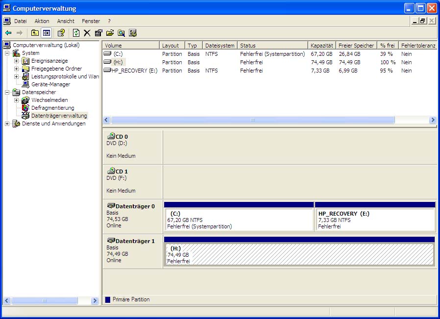 Denn: in meiner Not hab ich mir gedacht, nochmal XP-Setup und auf der Platte wieder nur 1 Partition eingerichtet. Aber kann ja nix bringen, weil Windows ja kein Dateisystem sieht, was glaube ich davor NTFS war.
