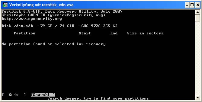 Aber Testdisk findet auch bei vertiefter Suche nichts, sagt nur "Bad Sector Count".