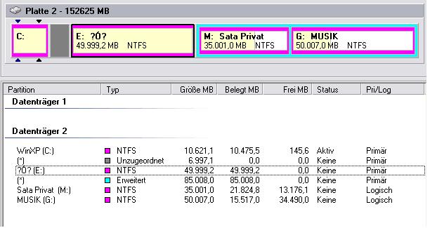wollte 2 Patitionen zusammenfügen mit PM 8.0 und nun sinbd 135 GB sprich 3 Pat.. verschwunden->Unpatitioniert. Musik-Privat-und Programme kein zugriff mehr oder sie erscheinen nicht mehr.