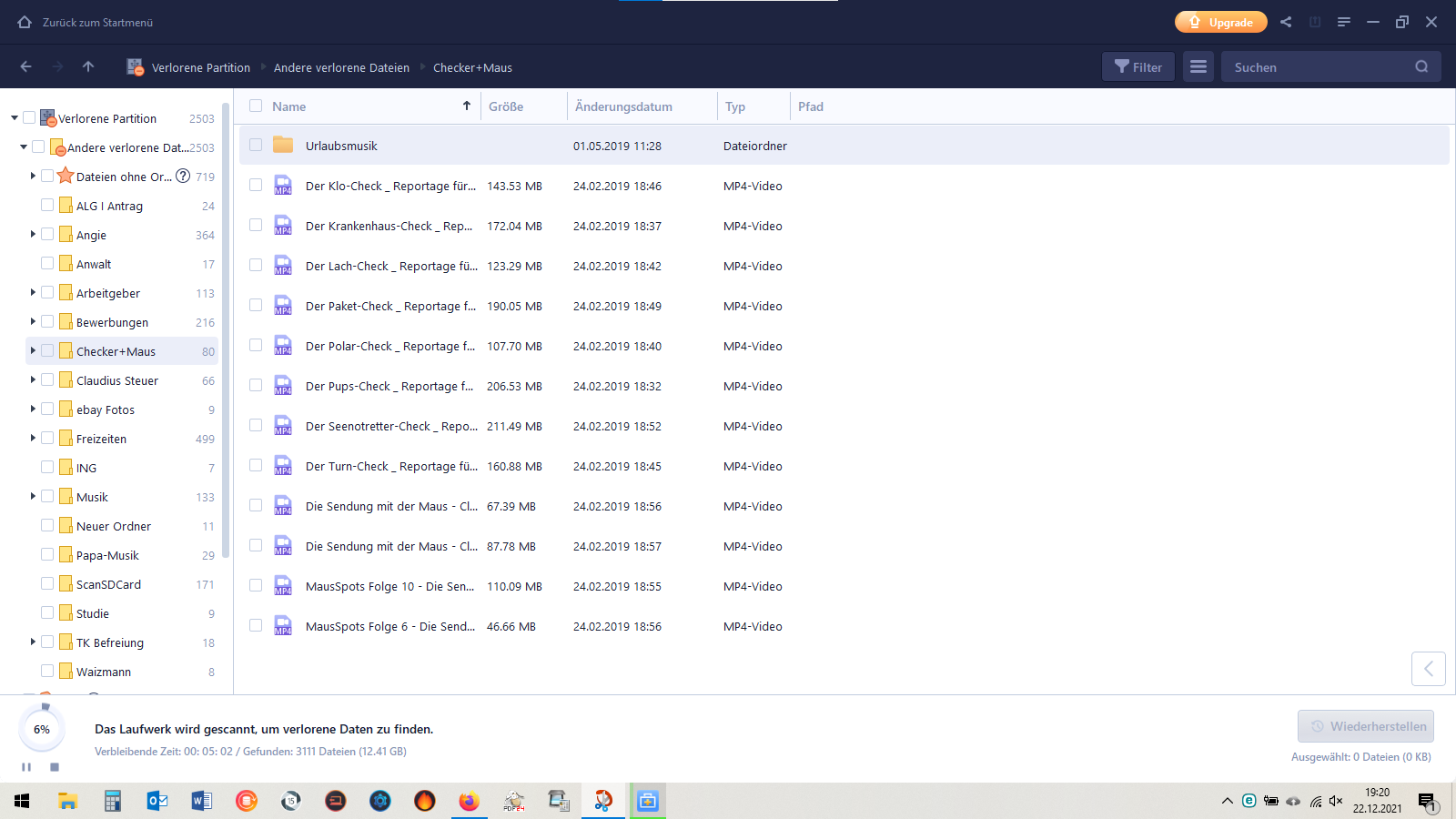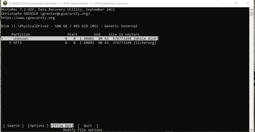 Nun könnte noch versucht werden, mittels der (hier bei ausgewählter Partition) angebotenen Möglichkeit [Options] mit den darunter liegenden Funktionen [Quick Search] bzw. [Deeper Search] nochmal weiter nachzuforschen - vllt. findet sich hier noch etwas.