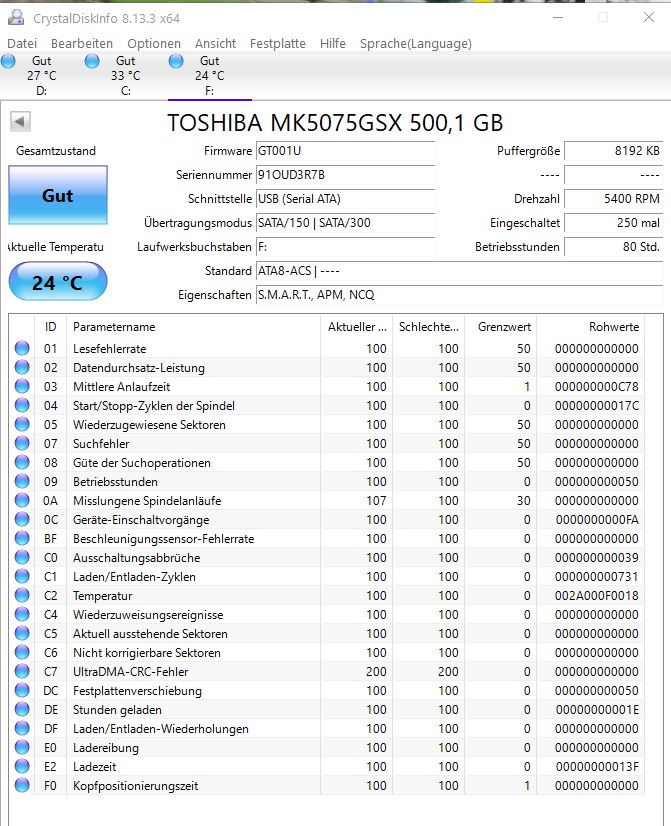 Auch wenn's sich (vermutl.) um eine via USB anschließbare externe HDD handelt, ist das Verhältnis von Betriebsstunden (80) zu Einschaltvorgängen (250) recht ungewöhnlich und würde bedeuten, dass sie im Schnitt ca. alle 19 Minuten ein- und ausgeschaltet wurde. Hoffentlich nicht, denn das wäre eigtl. ein nicht wirklich förderliches Intervall - auch, wenn die Platte scheinbar noch einen "gesunden" Eindruck vermittelt.