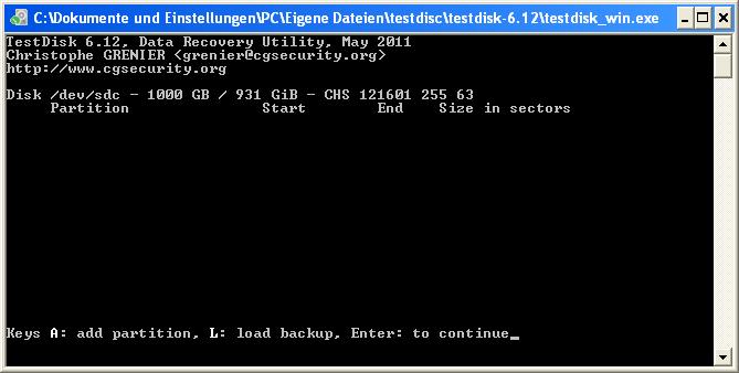 Starte Testdisk und wähle wenn nötig die Festplatte aus.