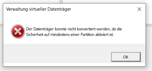 Das will ich natürlich nicht und wollte alle Partitionen wieder löschen und die MX500 zur Gesamtgröße herstellen. Nun versuche ich es im Win 10 in der Datenträgerverwaltung zu machen, aber er lässt mich nicht. Ich erhalte folgende Fehlermeldung: