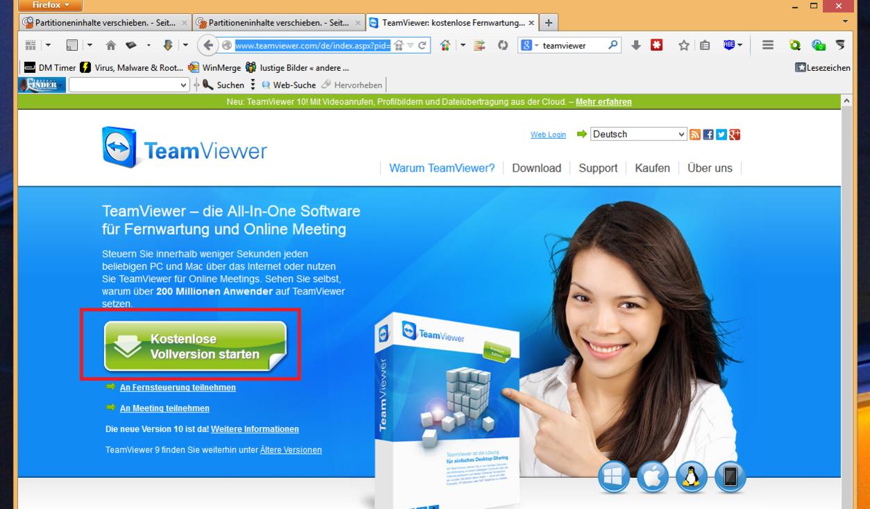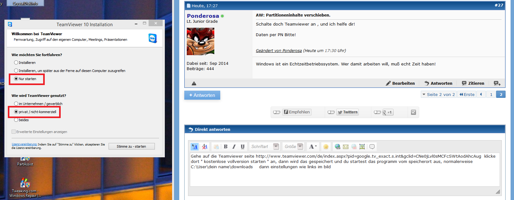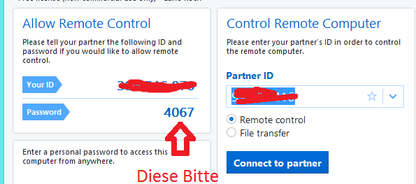 Gehe auf die Teamviewer seite http://www.teamviewer.com/de/index.aspx?pid=google.tv_exact.s.int&gclid=CNe0jLvl0sMCFcSWtAodAhcAug klicke dort " kostenlose vollversion starten " an, dann wird das gespeichert und du startest das programm vom speicherort aus, normalerweise C:\User\dein name\downloads dann einstellungen wie links im bild 1 , wenn teamviewer gestartet ist , hast du einen 9 stellige nummer und ein 4 stelliges kennwort unter fernsteuerung zulassen die du mir mitteilst, per PN.