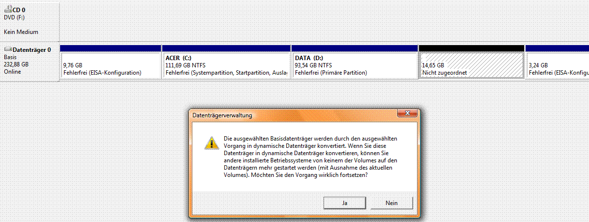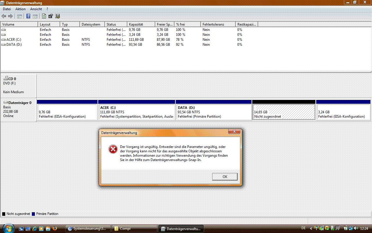 Hallo habe ein Acer Laptop Festpatte partionieren wollen, kann kann aber Part.nicht zuordnen bekomme immer eine Fehlermeldung part.lässt sich nicht formatieren.habe neues Laptop(Acer)bei meiner Tochter ihrem(ASUS) Laptop auch neu hat es ohne probleme funktioniert .Bitte um Hilfe Habe die Fehlermeldungen angehängt.Ich hoffe mir kann jemand helfen.Sollte meine Daten dringend von meinem alten Rechner aufs Laptop bringen.