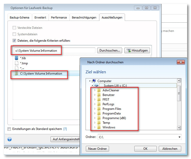 bei Acronis den SystemVolumeRestore-Ordner selbst ausschließen möglich ?