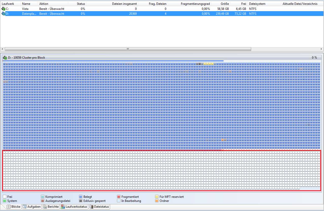 Man sieht deutlich: 73,2 GB ZUSAMMENHÄNGENDER FREIER Festplattenplatz. Kein einziger Cluster am Ende der Platte ist mehr belegt.
