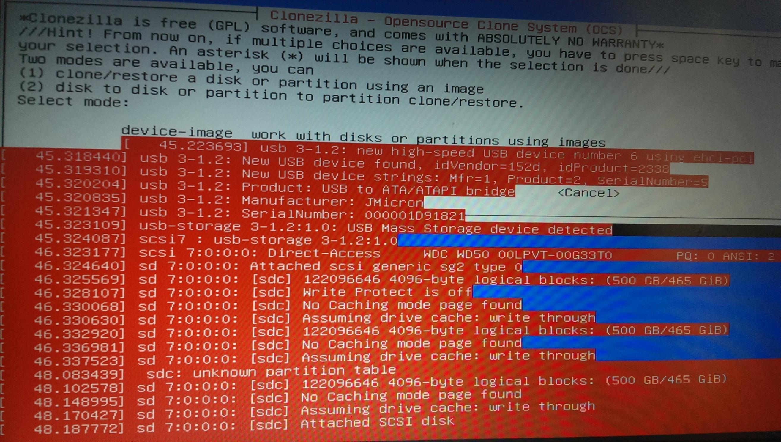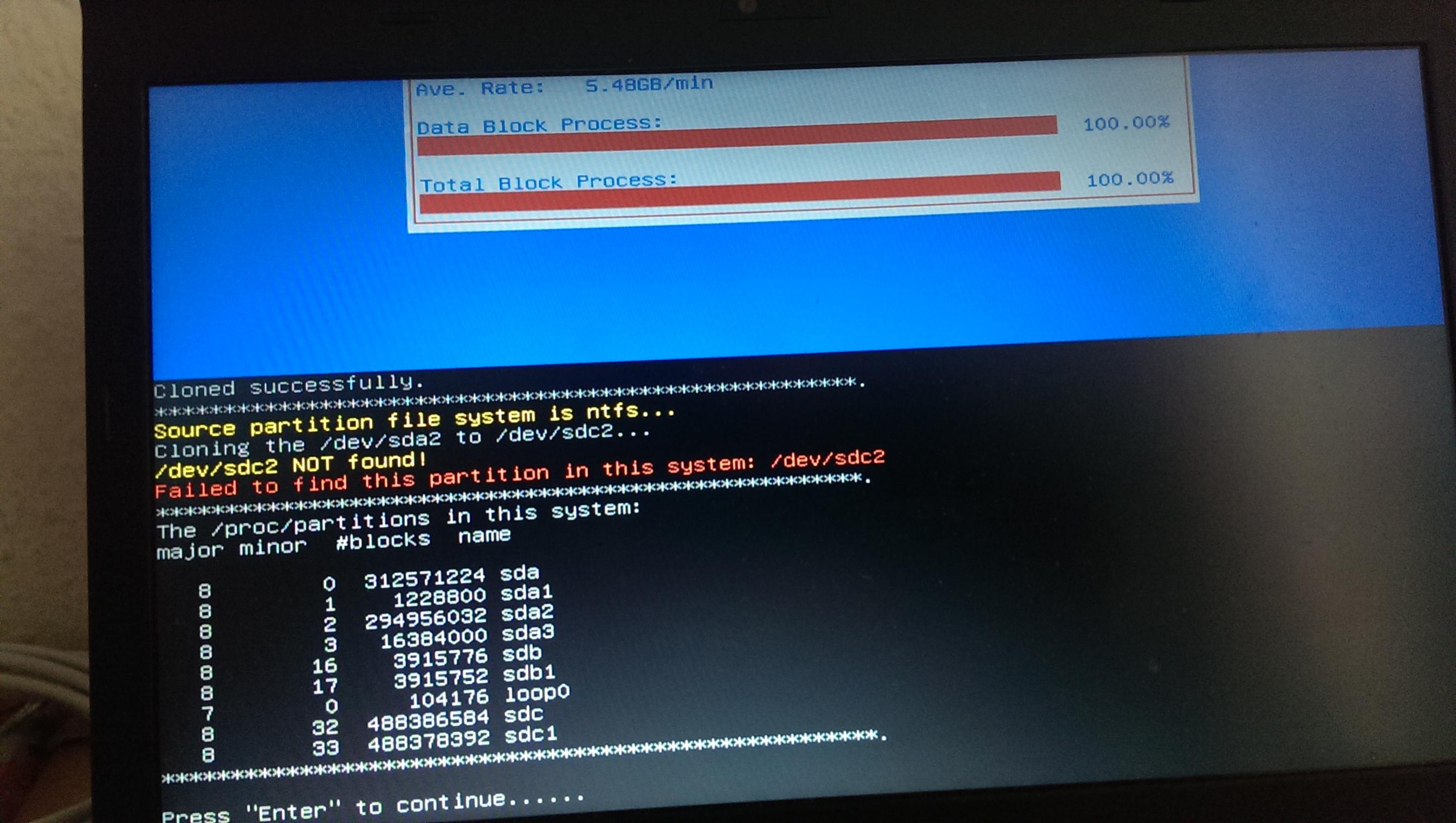 CLonezille beendet aber nicht den Vorgang sondern kopiert wohl nur auf sdc und sdc1 wie ich das vermute. Denn nur 2 std Kopiervorgang bei ca. 300 GB Festplattevolumne über USB ist etwas wenig.