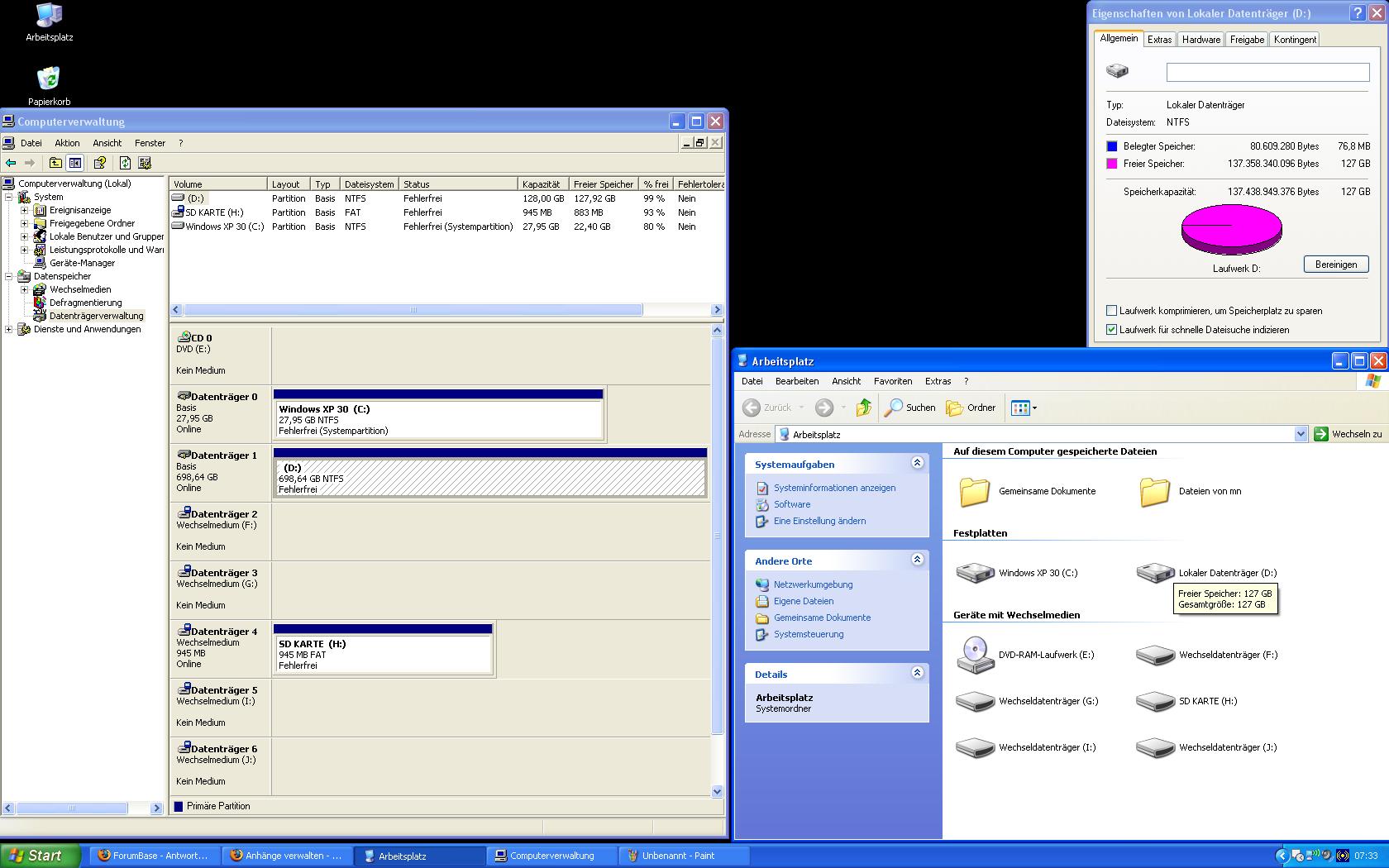 Nun kommt es. Ich will dann auf den Arbeitsplatz gehen um von der Datenplatte die Treiber zu instalieren und SCHRECK! Platte wird mit 127 GB angezeigt keine Daten drauf.