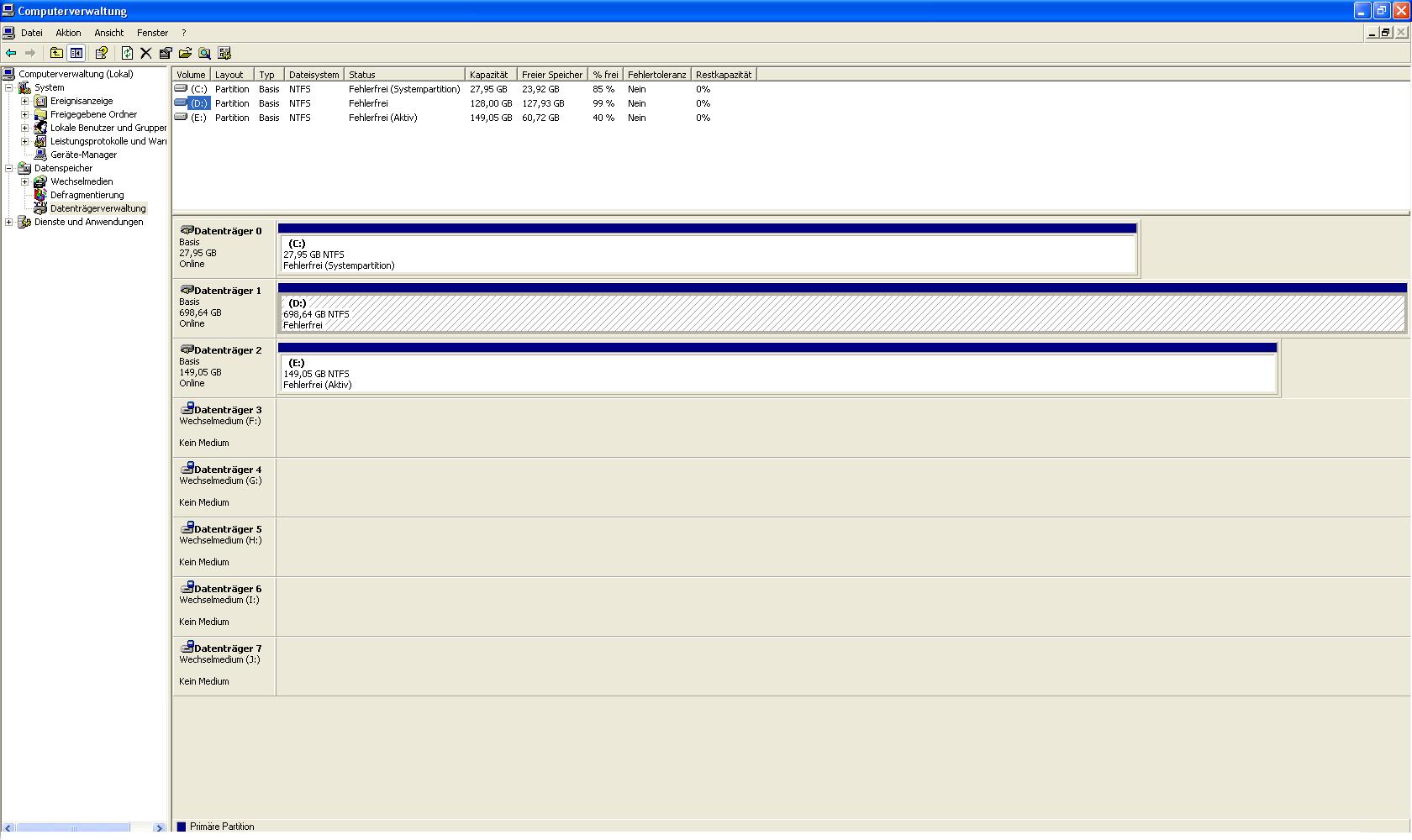 In der Datenträgerverwaltung wird die platte als D 698,64 GB NTFS Fehlerfrei angezeigt allerdings auch nur mit einer Kapazität von 128 GB. Habe es mal als anhang angehängt. habe die Platte dann sofort abgeklemmt damit nichts überschrieben werden kann und ich am Ende noch alle Daten verliere. Gibt es eine Möglichkeit bzw Lösung dafür wie ich an die Daten wieder dran komme? Sowas wie O&O möchte ich eigendlich nicht weil da eh am ende voll das datenchaos rauskommt. Es kann ja Irgendwie nur die Partition verändert worden sein.
