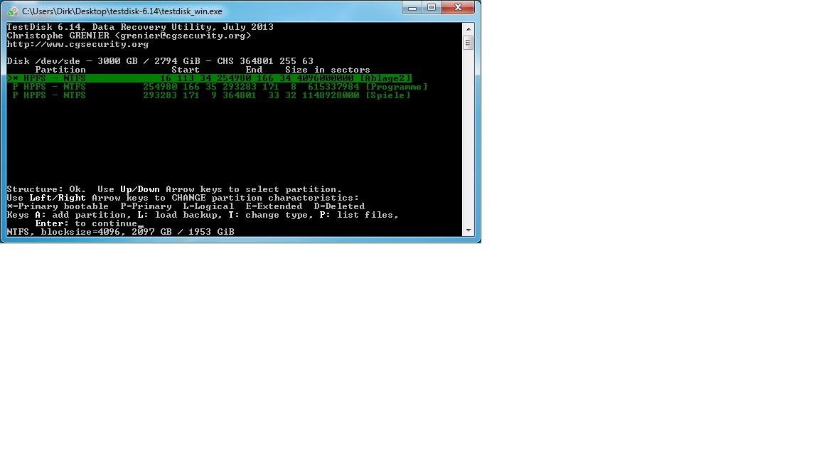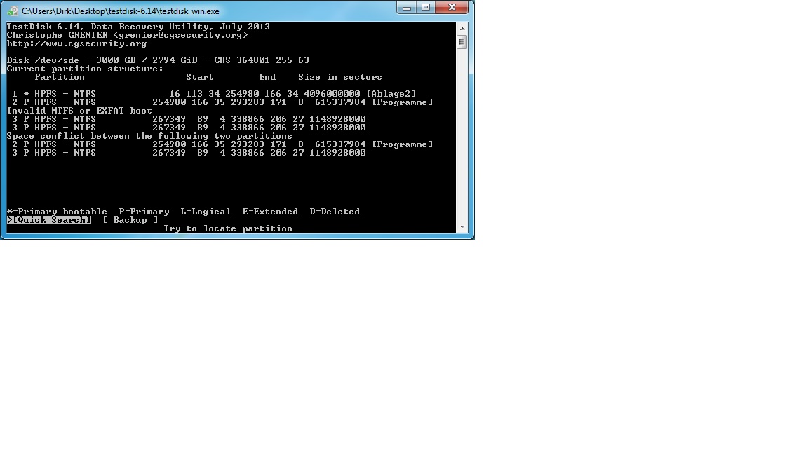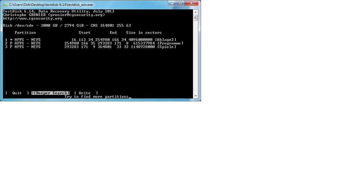 P.S. Angefangen hat es damit das meine erste Partition (Ablage)nicht von Windows als Laufwerk erkannt wurde, die anderen beiden wurden erkannt.Ich habe dann mit Testdisk versucht die Partition wieder herzustellen......