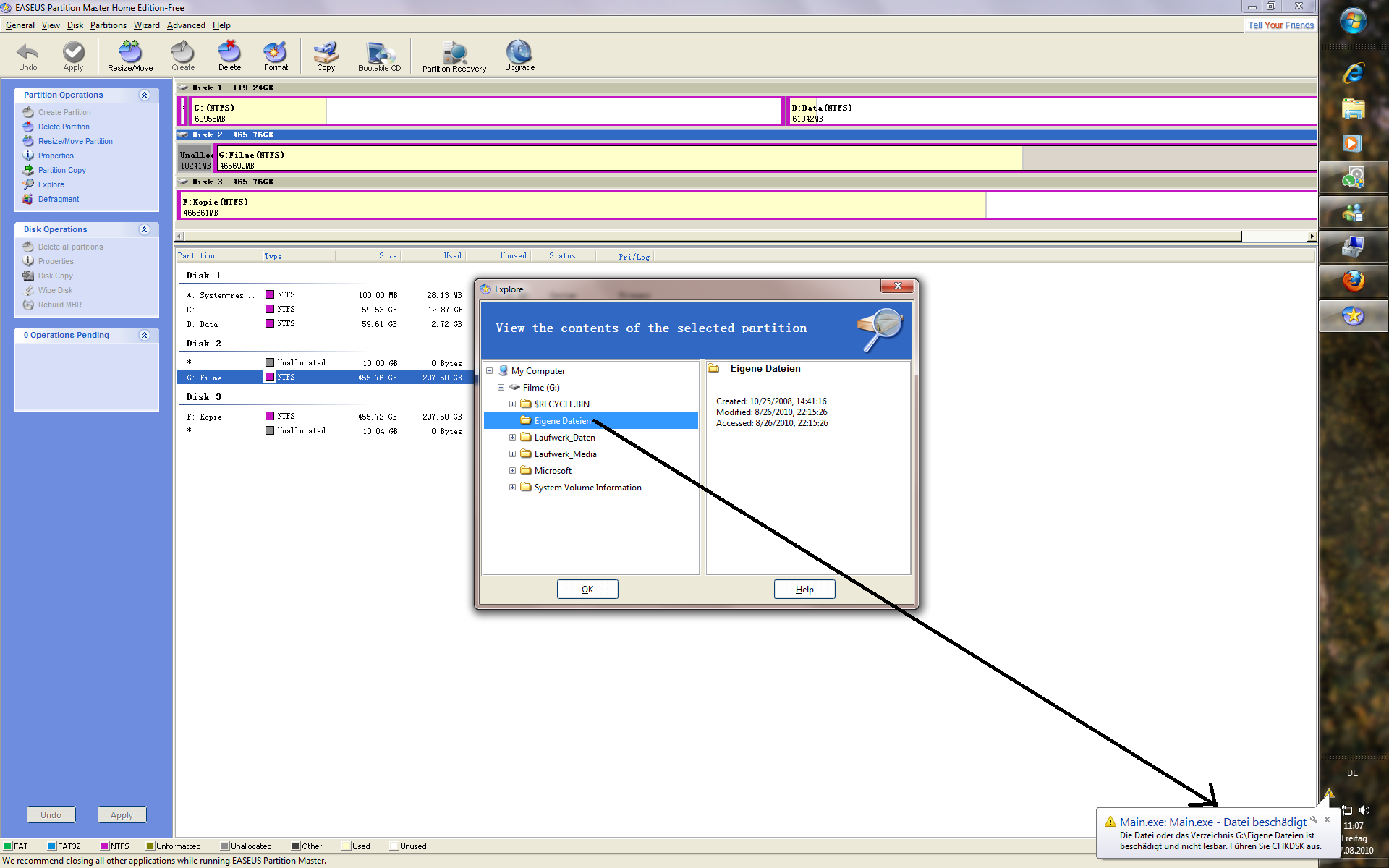 EASEUS bietet die Möglichkeit sich die Dateien anzuzeigen. Da erscheint auch die Fehlermeldung, dass "Eigene Dateien" nicht lesbar ist (siehe Screenshot).