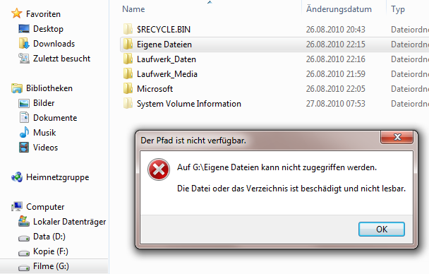 Aber gerade der Ordner "Eigene Dateien" lässt sich nicht öffnen, Fehlermeldung "Die Datei oder das Verzeichnis ist beschädigt und nicht lesbar" (siehe Screenshot).
