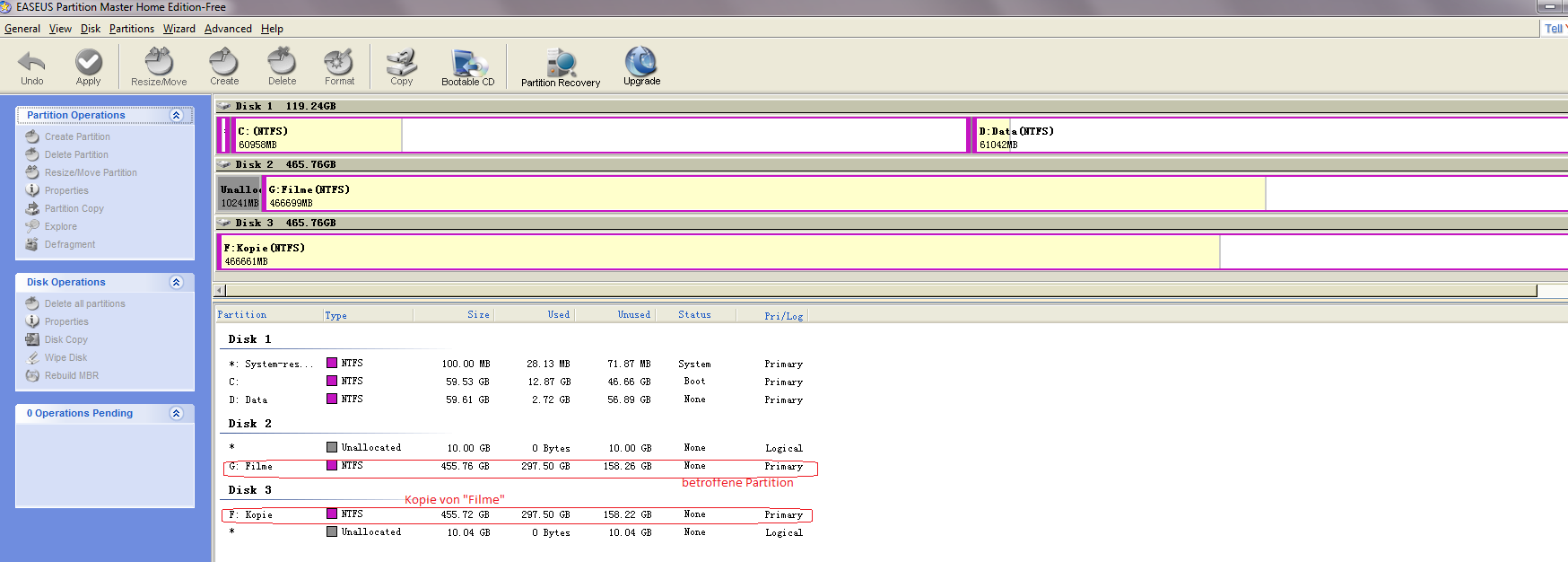 Ich habe noch ein Screenshot von EASEUS Partition Master gemacht. Dort sind man meine Festplatte. Insgesamt sind es 3 Festplatte.