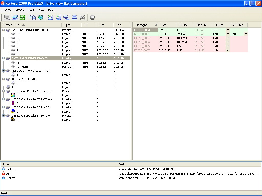 Nun bin ich mal hingeangen und habe mit Restor 2000 Pro in der Demo mal kurz die Platte checken lassen. und zwar von 64 kb bis 31.5 GB mehr konnte ich da leider nich angeben