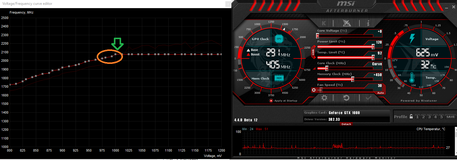 3. Die Werte im orangen Kreis habe ich dann von +80 auf z.B +56 gezogen, damit am Ende GPU 2000 MHz statt 2025 hat.