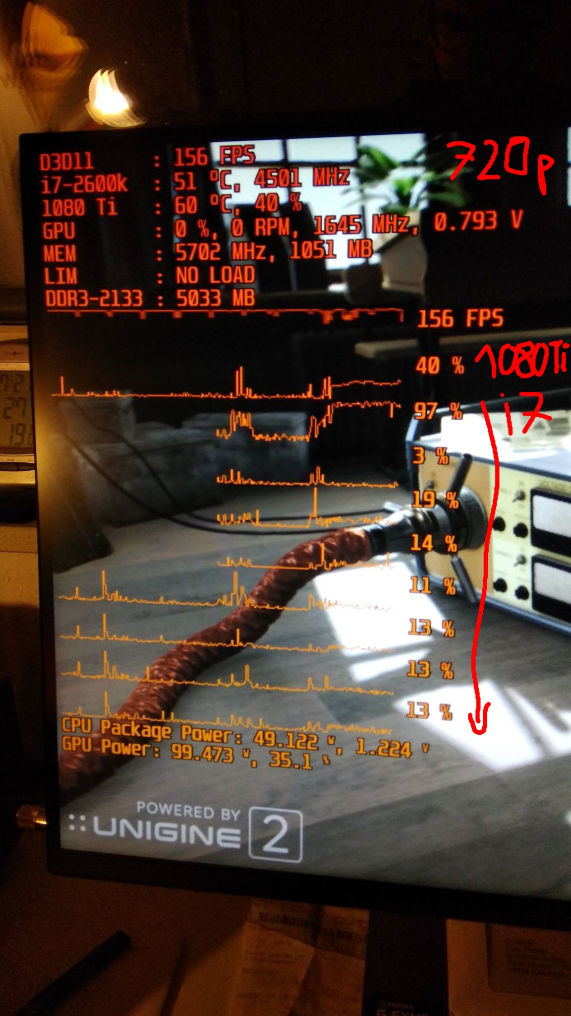 Schau dir mal die Auslastung genau an. Ein Thread am Limit, ein weiterer zur Hälfte ausgelastet (sieht man ohne HT besser). CPU Limit ist es dennoch und dementsprechend niedrig taktet die GPU.Youngtimer schrieb:Ich habe mit meinem Sandy Bridge auch mal die 720p Einstellung versucht, aber die 1080Ti kommt gar nicht die Gänge. Bleibt bei 0.712 Volt und 1450mhz. Frameraten sind zwar über 150 FPS aber die GPU gibt kein Vollgas. Woran könnte das liegen? Mein i7-2600k läuft auf 4,5Ghz und wird nicht ansatzweise ausgelastet.