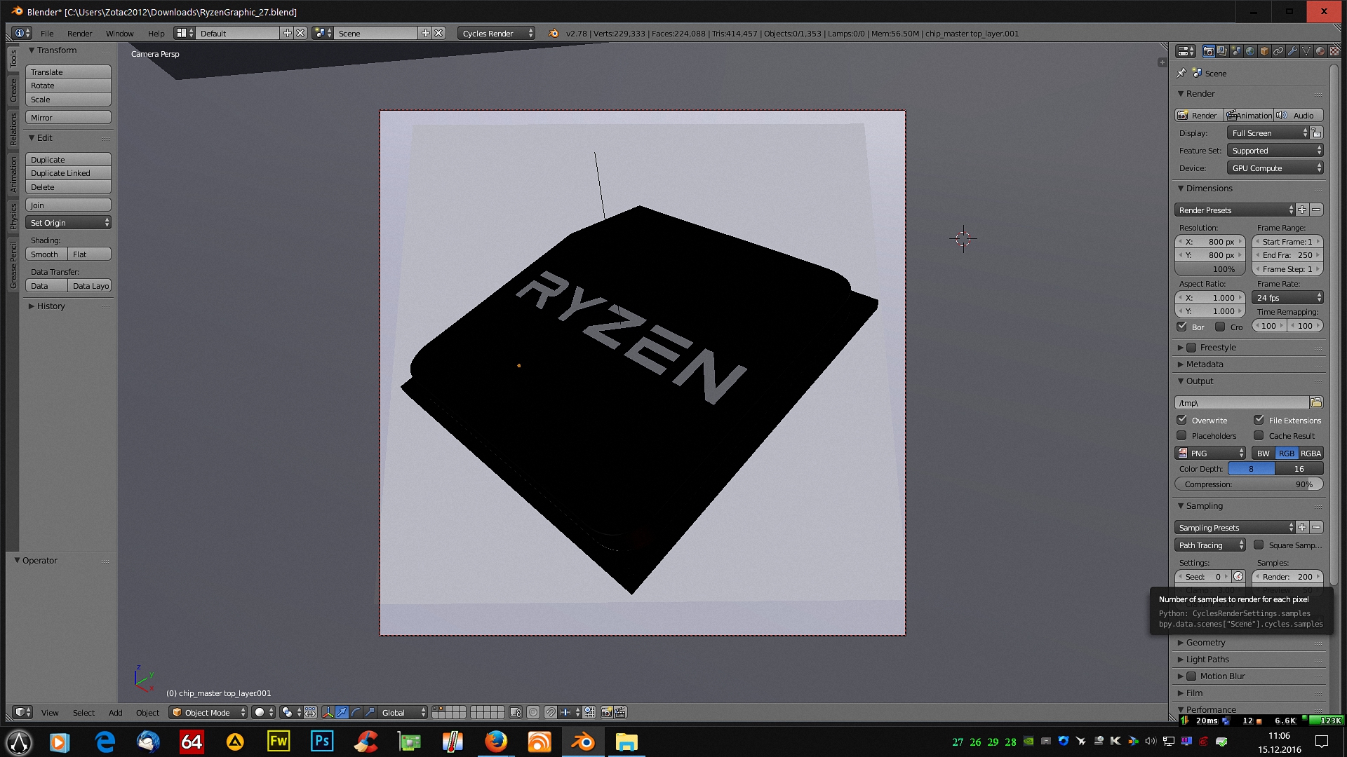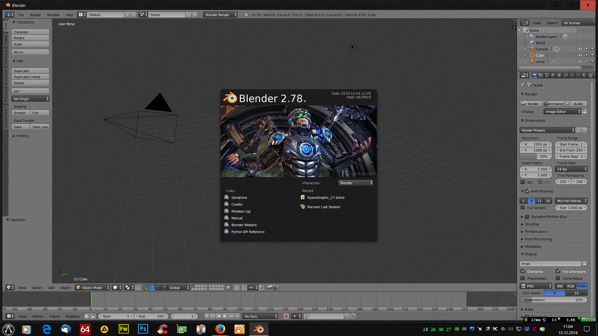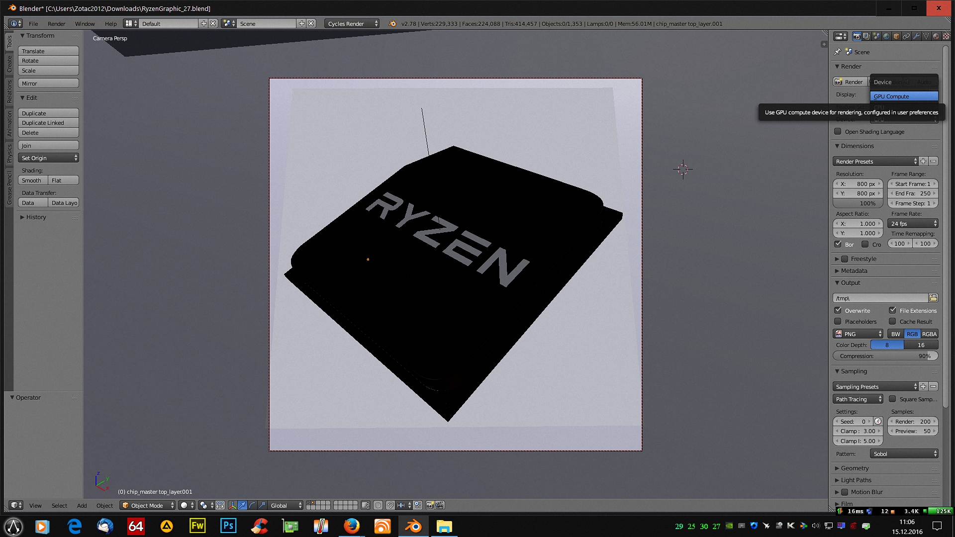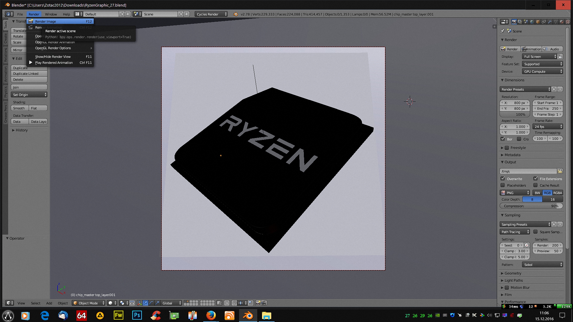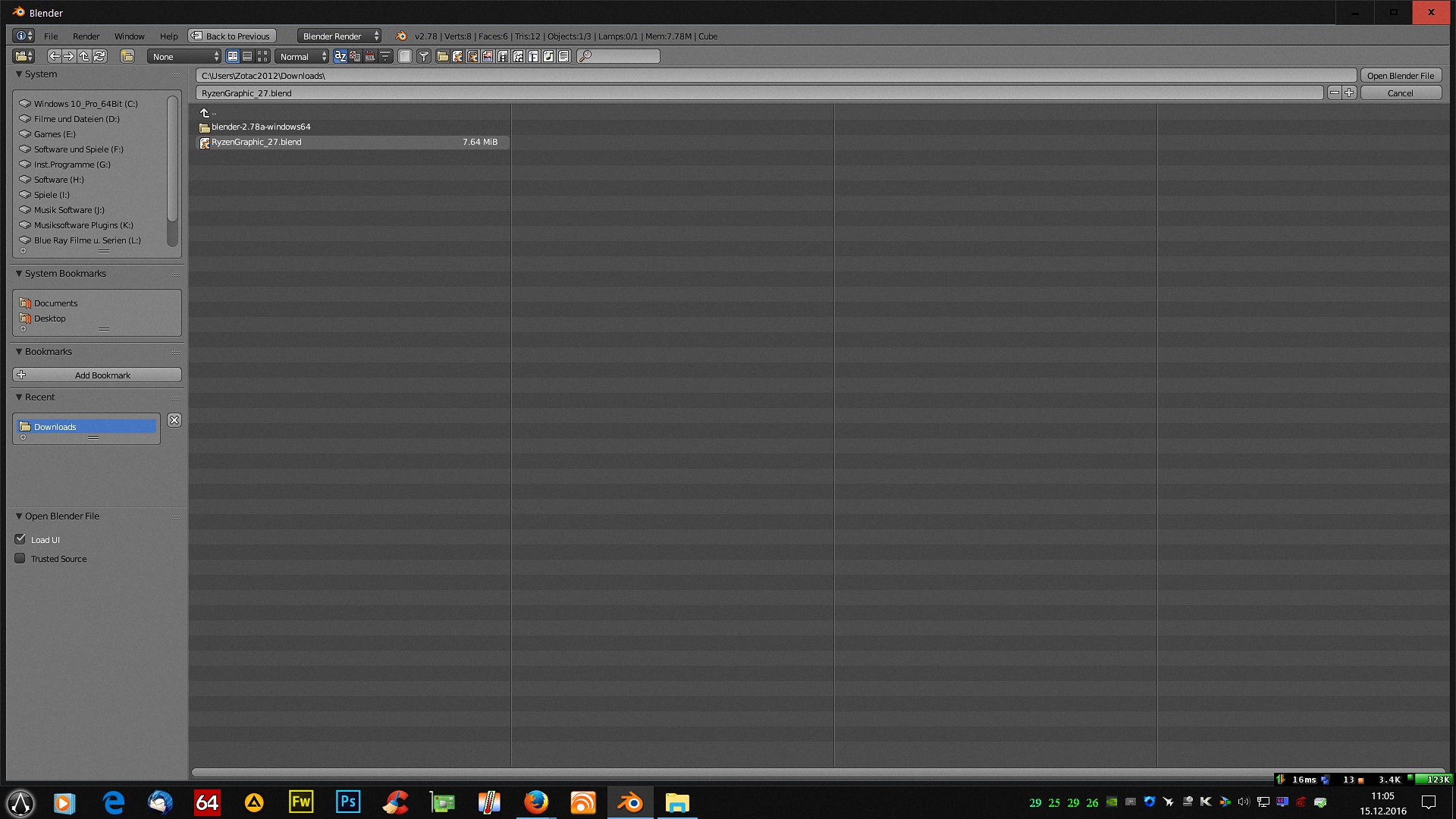 Also um den Render Test im Blender Version 2.78a mit dem RyZEN AMD Logo durchzuführen, machst Du folgendes: