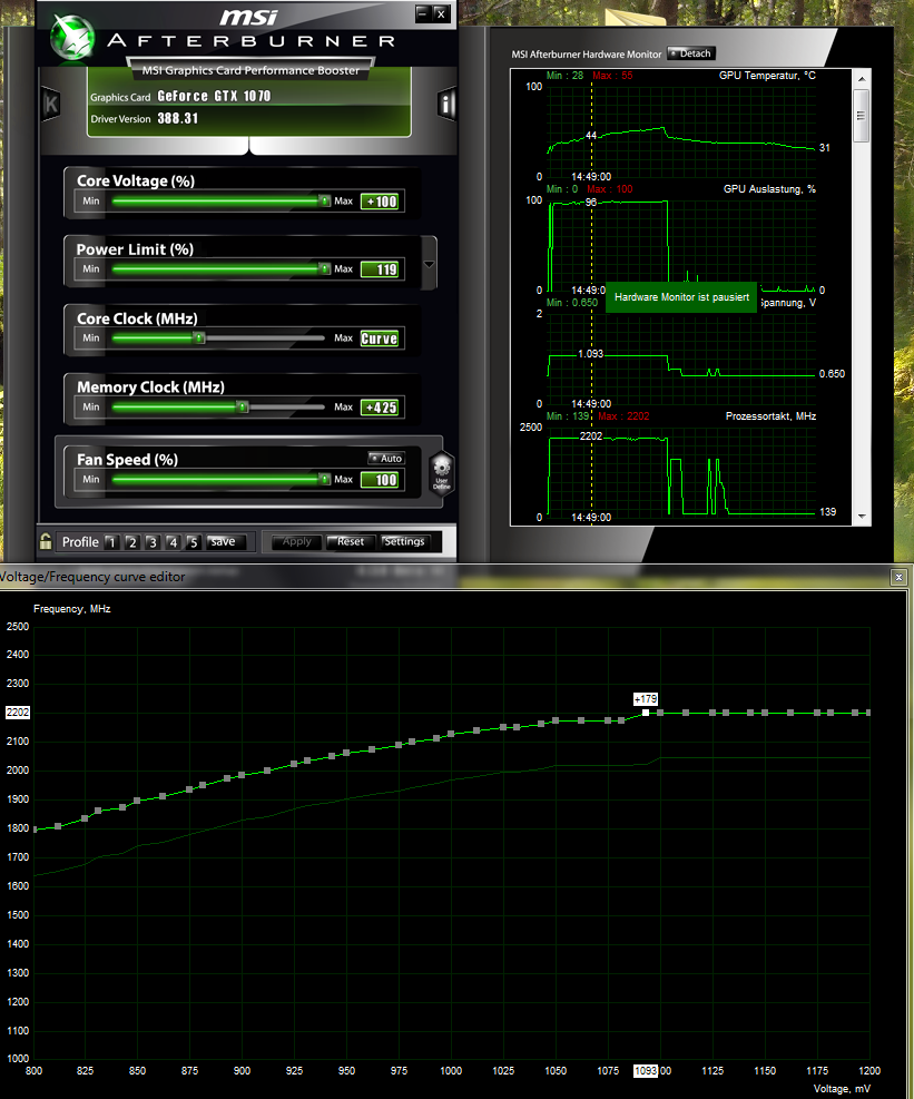 Hui, hatte bisher max. OC nur per Offset gemacht (startet wegen Temp bei 1,050V). Jetzt mit Curve die 1,093V konstant angelegt -> siehe da, 2,202 GHz GPU laufen durch!
