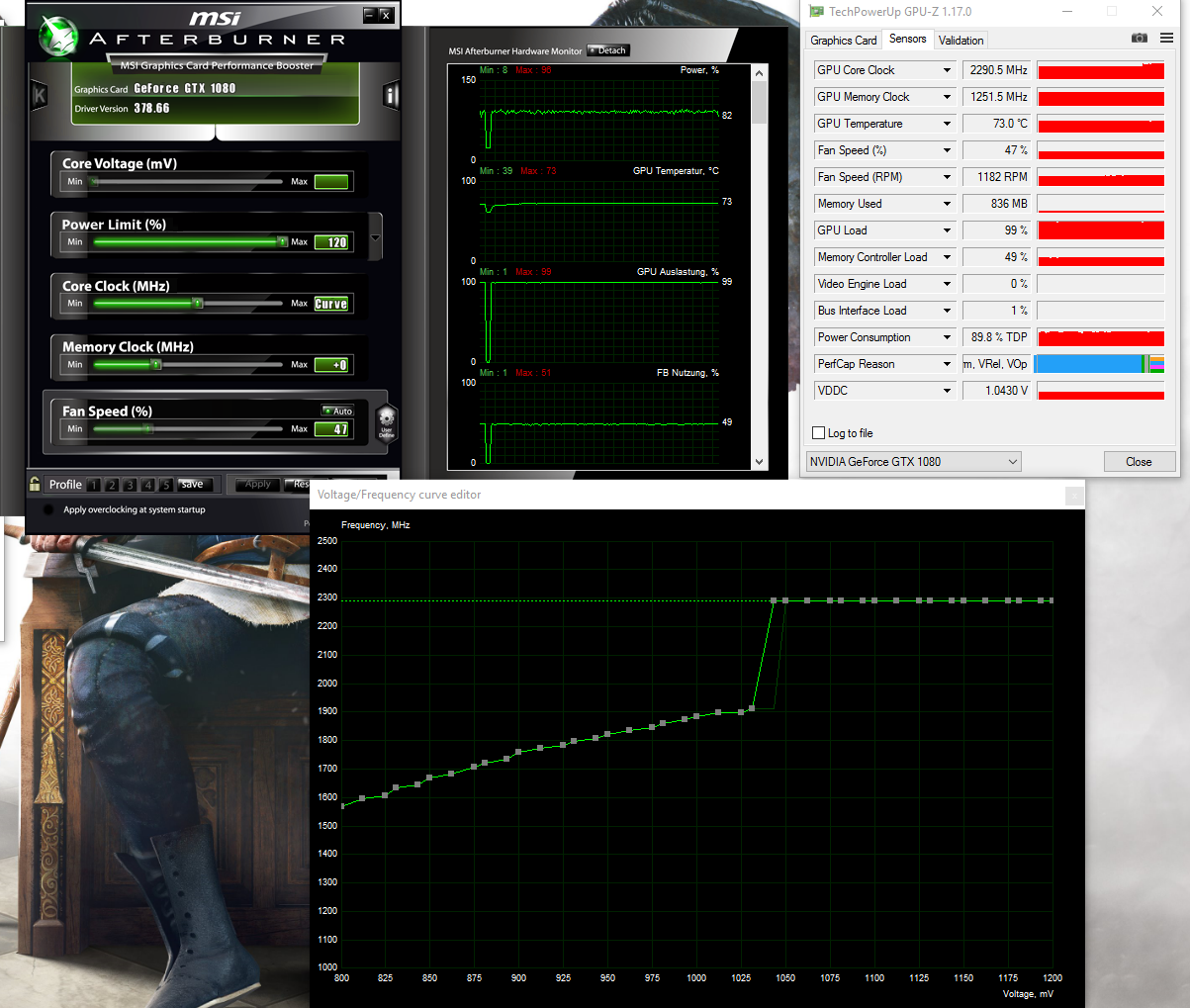mit Afterburner : Core +110 und Speicher + 100 = Minimum 2038 MHz/5355MHz 1.063V