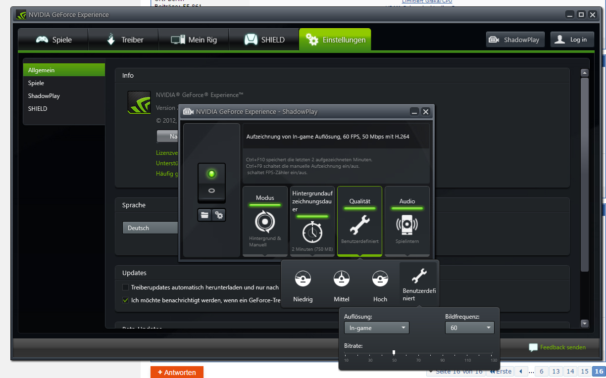 Ich nehme mit Shadowplay auf, Ingame-Auflösung, 60 FPS, 130Mbit. Und dann meistens direkt nach YT hoch. Mein altes Premiere schafft kein 4K@60FPS in h264, also müsste ich unkomprimiert schneiden und nachträglich nach h264 komprimieren ... das ist mir zu viel Aufwand :-)