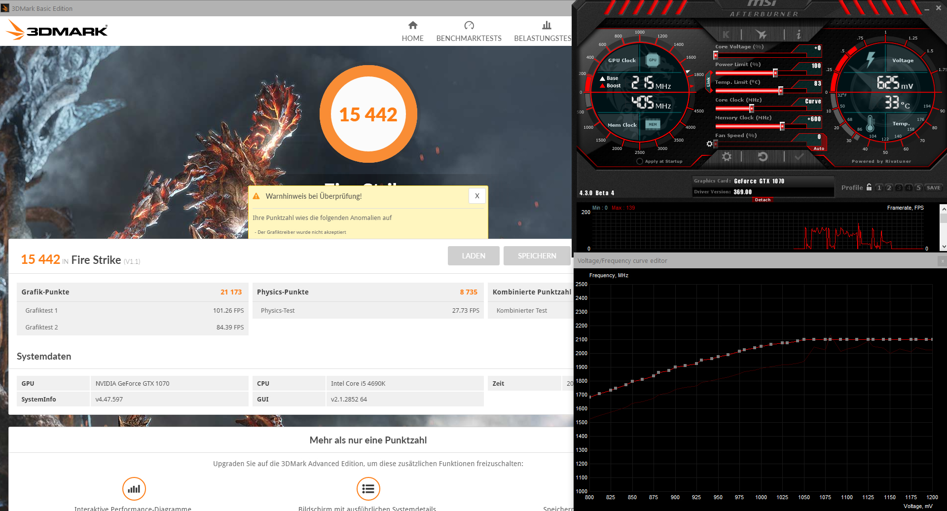 Ich habe mal im Curve-Editor den Takt bei 1050mV auf 2101 MHz gesetzt, den Speicher auf +600 MHz übertaktet und die Spannung wie auch das Power Limit nicht angehoben. Das ganze habe ich dann mal durch den Firestrike Benchmark gejagt um zu zeigen, auch wenn hier viele immer etwas anderes Behaupten, das man auch ohne Power Limit und Over Voltage Erhöhung gute Werte erreichen kann.