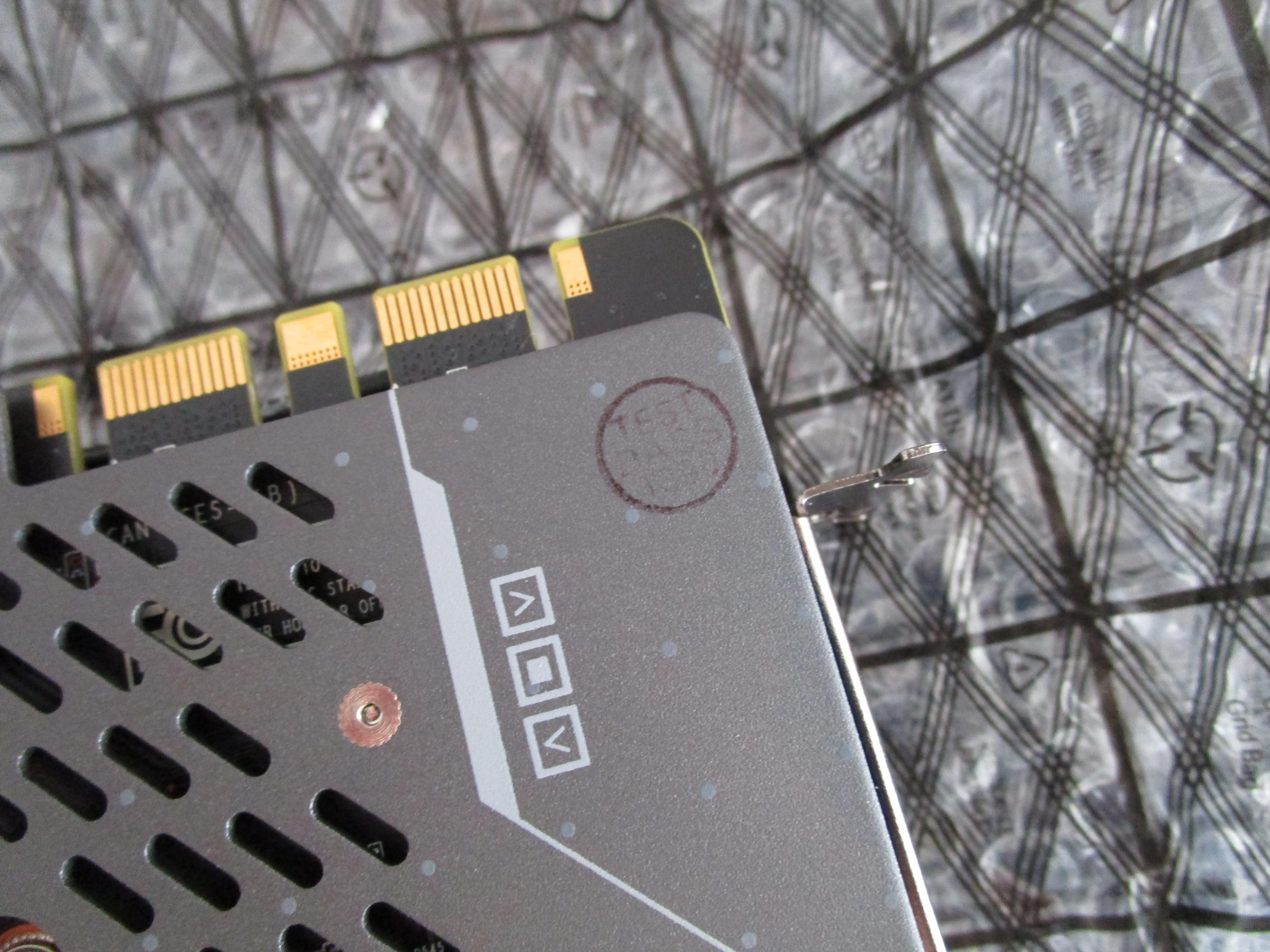 Ich bin es eigentlich von Zotac gewohnt das Schutzkappen an der Grafikkarte verbaut wurden. Ist bei meiner nicht der Fall. Was mir noch aufgefallen ist, ist so ein Stempel mit Test PASS oder so. Keine Ahnung was das heißen soll? Hoffe man kann es auf dem Photo erkennen.