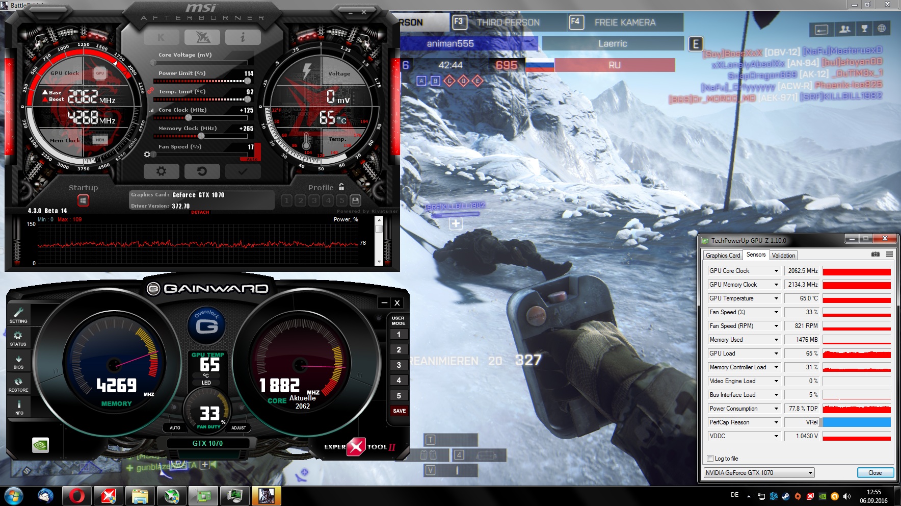 Ich habe 2012 MHz gewählt, weil die Pascal GPU einmal runter Taktet, aber dann bis zum Schluß mit 2000 MHz durchläuft und obwohl ich den Speicher auf +700 MHz auf 4705 MHz übertaktet habe, steigt die Temperatur mit meinem MK-26 nicht über 50°C