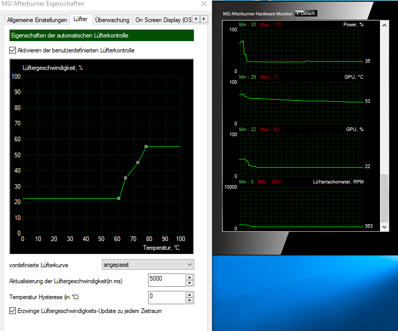 Die Karte läuft im Unigine Heaven nie mit über 50% Lüfter-RPM, eher so mit 42-45%..deswegen den letzten "push" bei 79° bei 55% eingestellt ist. Hätte gerne noch so einen Eckpunkt um sicher zu gehen ^^