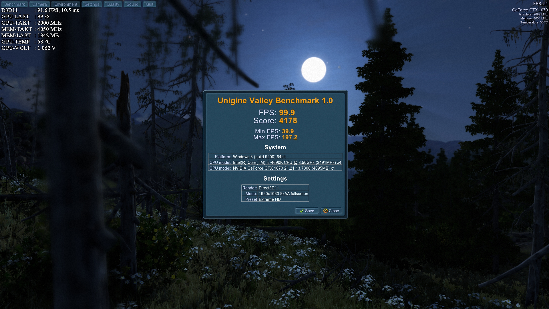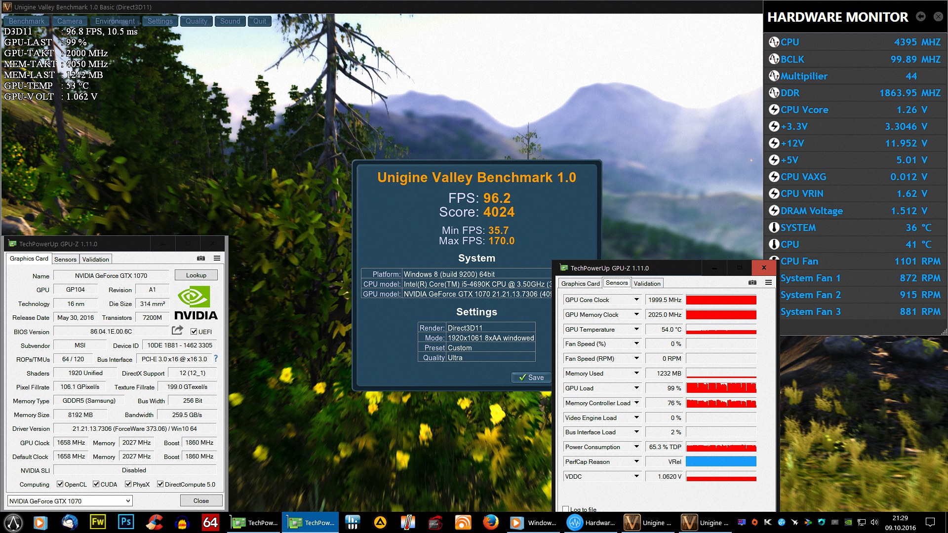 Ich habe hier mal den Unigine Valley Benchmark durchgeführt ohne OC also mit den @Stock Werten mit meiner MSI GTX 1070 Gaming X [mit dem Gaming Z Bios], der Werte wäre noch etwas höher, aber zum einen habe ich den Fenstermodus gemacht [um die Screens von GPU-z und meinem Hardware Bios Monitor vom MB einzublenden] und zum anderen habe ich im Geforce Experience bei Shadowplay den Desktop-Modus aktiviert [für die Screenshots], was ja bekanntermaßen auch noch die Leistung und somit die Punktzahl etwas mindert!