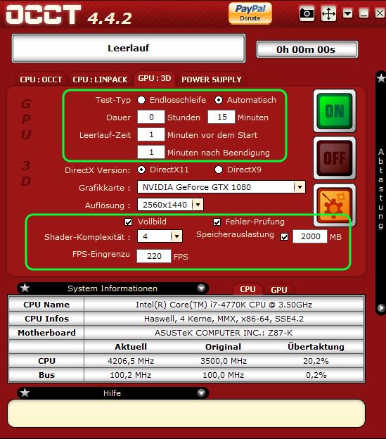 Wichtig: Ihr müsst den FPS-Begrenzer in OCCT so wählen, dass eure Karte in etwa ein PowerLimit von 90% erreicht, weil die Karte unlimitiert nur noch mit vielleicht 1,4Ghz laufen wird bei 0,7v, das bringt ja als Stabilitätstest nichts. Bei mir waren das etwa 220 FPS bei WQHD Auflösung, damit lief noch der maximale Spannungsschritt mit maximaler Taktrate und 2Ghz waren da bei weitem nicht stabil zu bekommen.