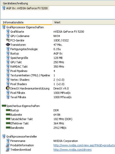 Aber was anderes: die Grafikkarte ist im Prinzip eine nochmals arg beschnittene GeForce FX 5200 (da 64bit 366MHz Speicher, die richtige FX-5200er hatte 128bit 400MHz).