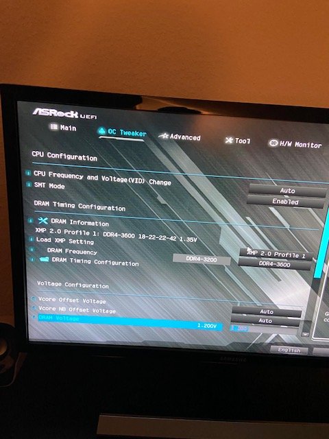 Wenn ich es auf 3200 Stelle sieht es so aus. Und wenn ich dieses XMP Profil einstellen will wird die Zahl auf dem Letzten Bild (DRAM Voltage) ganz unten rot.