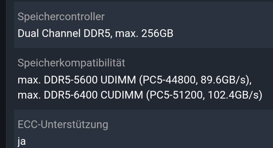 Es heisst doch das bei von Intel vorgesehener Bestückung einmal ddr5.5600 empfohlen wird, und bei cudimm 6400.
