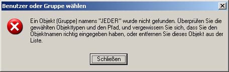Leider kann ich aber nicht die Gruppe JEDER hinzufügen, denn ich bekomme immer folgende Fehlermedlung: