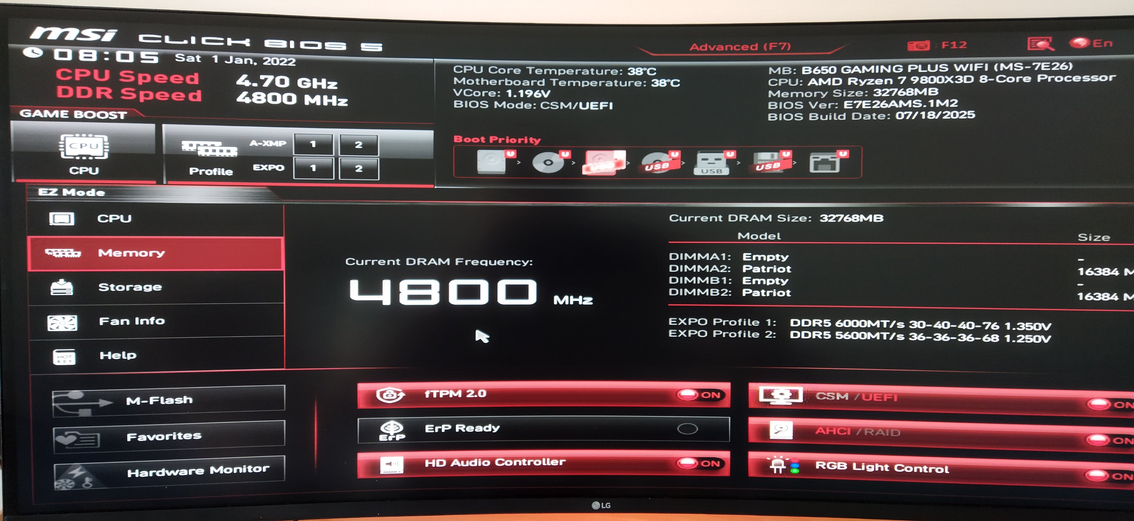 Im UEFI habe ich dann die zwei verfügbaren expo bzw. xmp profile ausprobiert. Dies hat eigentlich nur zur Folge, dass die Zeit bis zum automatischen Neustart und Ankunft im uefi variiert und dass doet dann die vorher gewählten Taktraten angezeigt werden. Ich komme aber immer noch nicht uber das uefi hinaus.