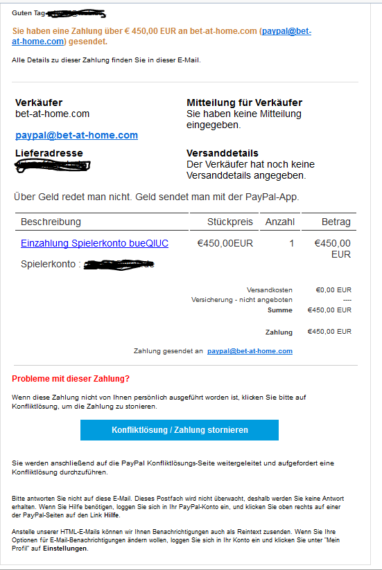Meine sofortige kontrolle des Pay Pal Kontos ,