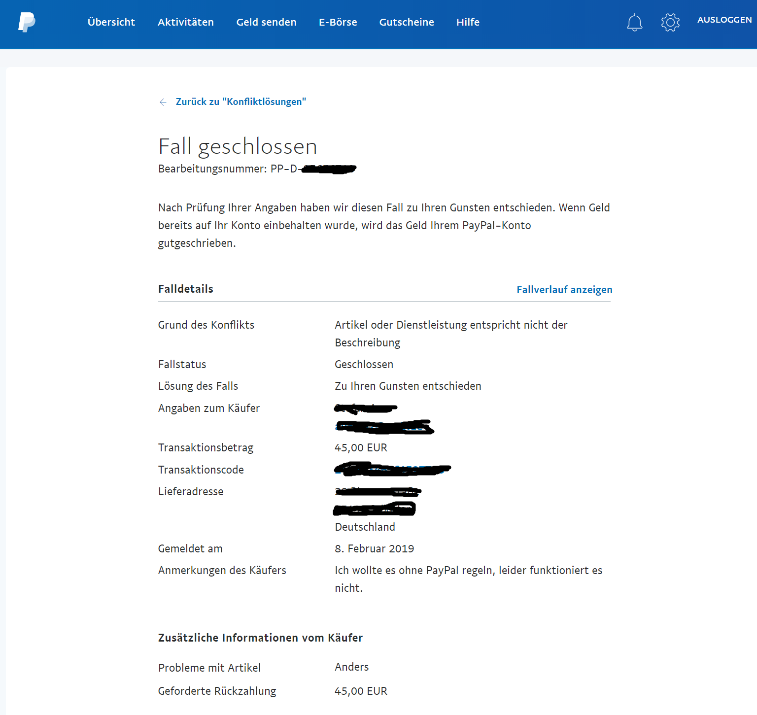 PayPal hat den Fall geprüft. Ich habe Screenshots und Chat dort zur Auswertung hochgeladen und nun hat PayPal entschieden: