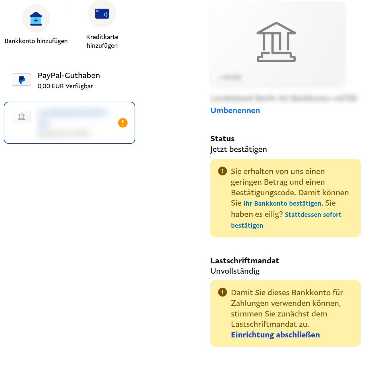 Alles was ich da tun kann ist den Link "Ihr Bankkonto bestätigen" anzuklicken. Damit wird aber offenbar eine neue 1-Cent Überweisung angestoßen. Danach wird zwar ein Feld zum Eingeben des Codes angezeigt, das verlangt aber offenbar den Code aus der neueren Überweisung. Der aus der ersten ist nicht mehr gültig. Wie komme ich aus diesem Loop raus? Also außer auf Paypal zu verzichten...