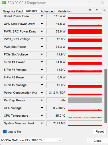 ABER! Heute mache ich einen 3DMark-Test, der erstaunlich schlecht ausfällt. Ich checke nebenher mit GPU-Z und stelle fest, dass die Graka über den 2ten 8-Pin-Anschluss keinen Strom zieht (0 Watt). Aber 12V werden angezeigt.