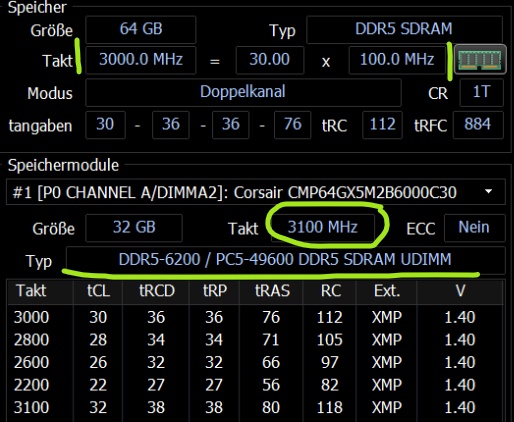 Hast du den Speicher übertaktet? Was passiert, wenn du das XMP-Profil mit 3000MHz auswählst? Wenn du das richtige Profil geladen hast, müsste in beiden Feldern 3000 MHz stehen. Oder HWInfo liest Mist aus.