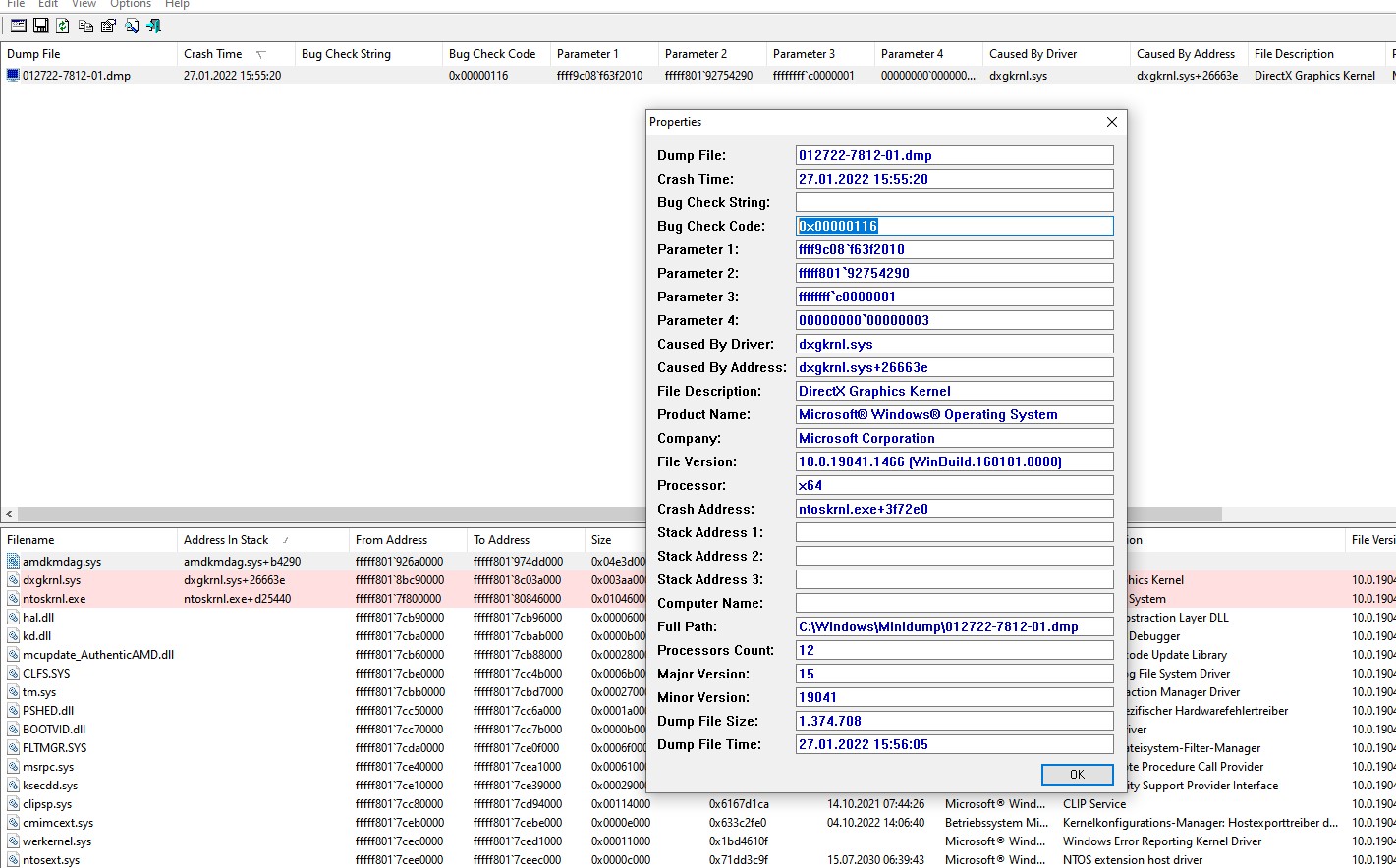 heute habe ich das komische Problem gehabt, dass mein Rechner abgeschmiert ist, nachdem ich relativ leicht mit meinem Fuß gegen den Rechner unter meinem Schreibtisch gekommen bin. Ich lade euch für den Zweck mal die .dmp-Datei hoch. Laut dem was ich sehen kann ist es der Adrenalin Treiber, nur verstehe ich nicht was der mit dem Stoß zu tun haben soll. W10 ist up2date und sonst habe ich bisher auch keine Abstürze gehabt. Den Rechner habe ich zur Sicherheit auch geöffnet und überprüft ob alles fest sitzt. Alles in Ordnung soweit. Nach dem Absturz läuft auch bisher alles wie es soll. Mein System könnt ihr auf dem Screenshot sehen. Ansonsten habe ich Furmark mal ne Stunde laufen lassen und das geht auch wunderbar. AC Origins und COD ebenfalls.